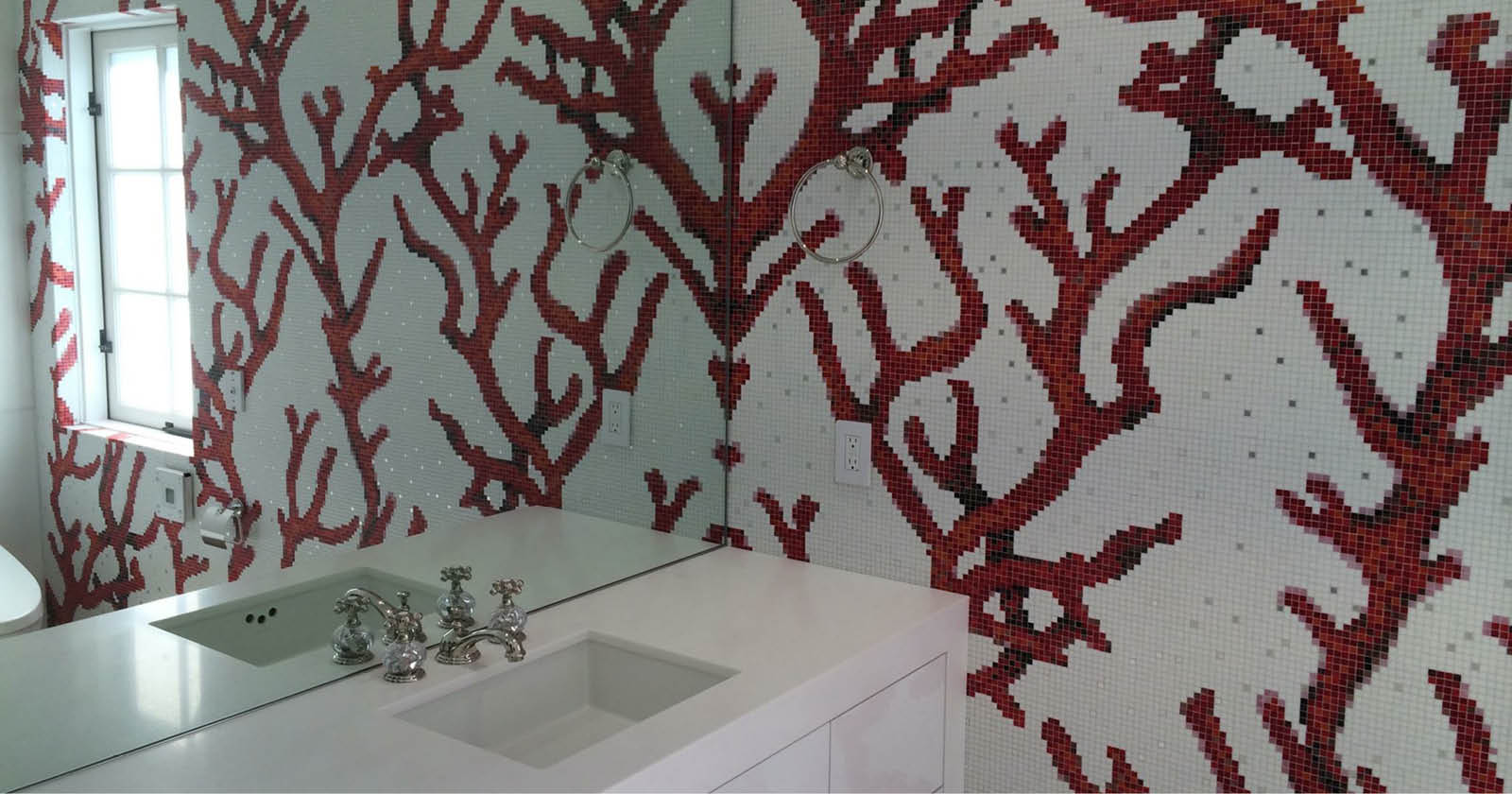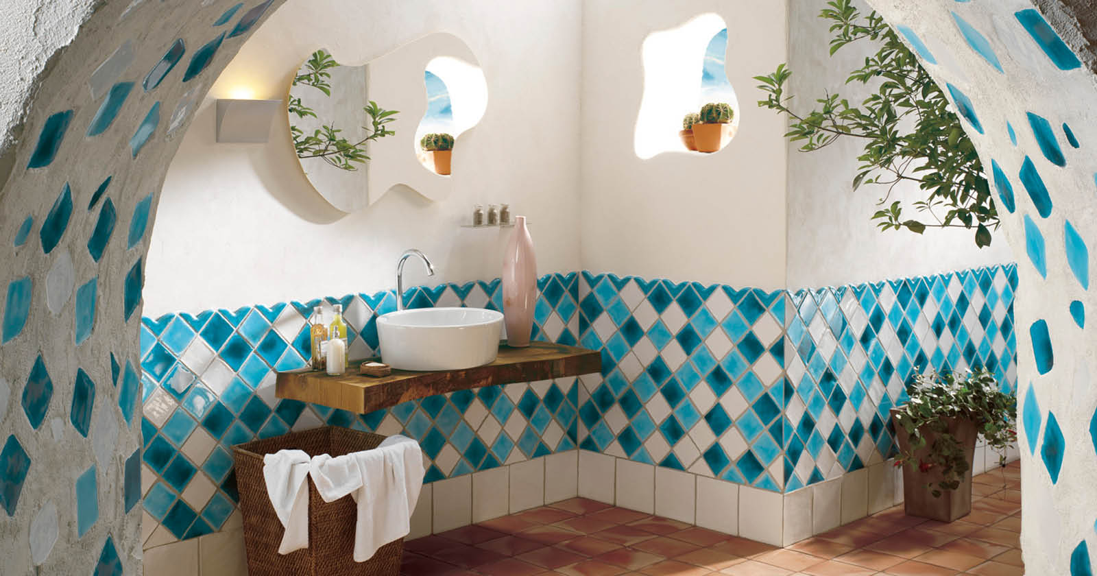 Se non si vuole fare proprio tutto in legno, una soluzione che a noi piace moltissimo è l’abbinamento di un mobile lavabo effetto legno abbinato ad un mosaico sui toni del verde acqua e dell’azzurro o delle piastrelle che riportano temi marittimi – pesci, barchette, stelle marine, ecc. – per un risultato originale e vivace.