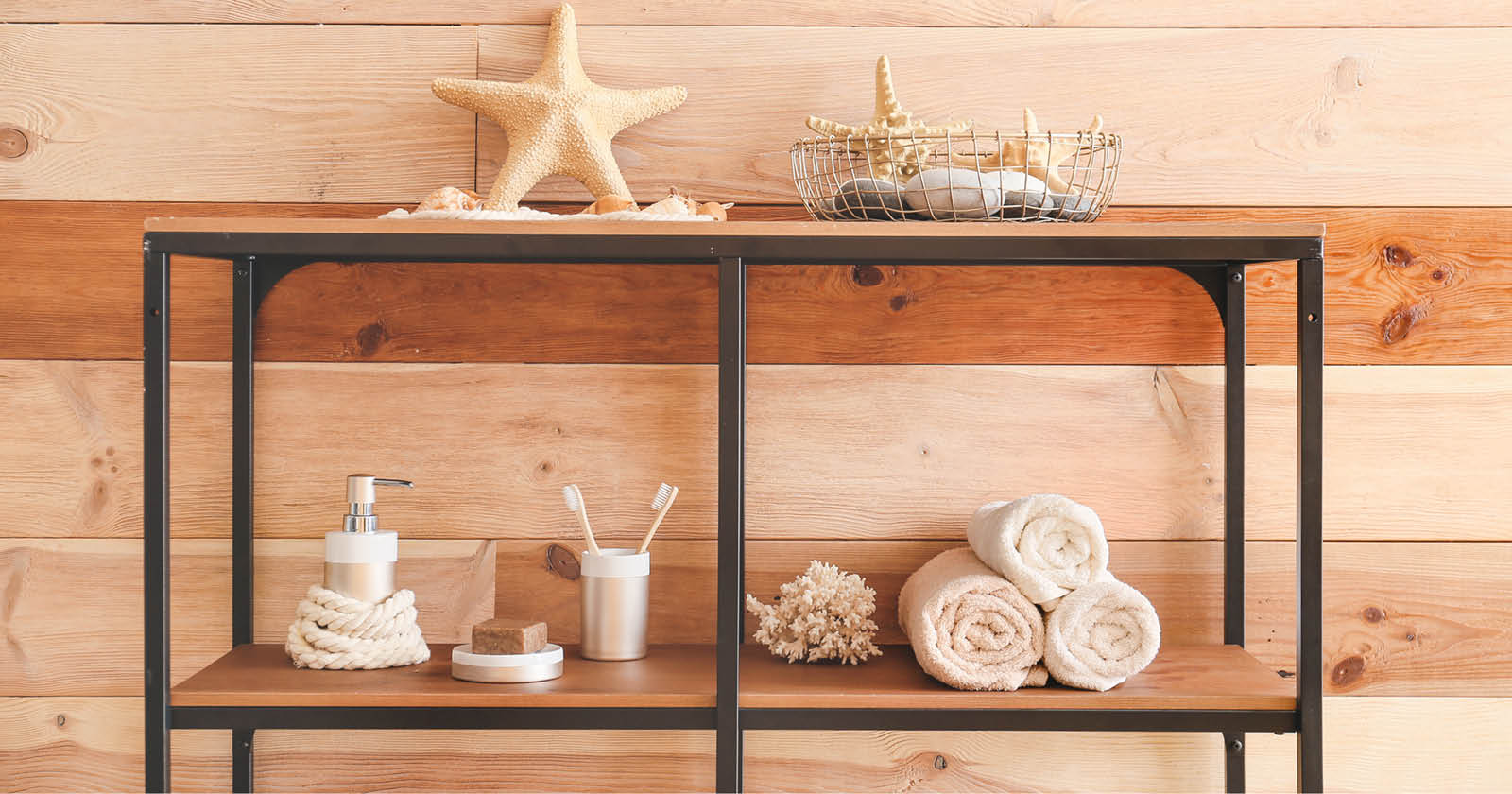 I materiali che troviamo nello stile coastal sono concentrati in poche varietà. Il legno la fa da padrone: rigorosamente grezzo, richiama quel legno dall’effetto “vissuto” come le tavole lasciate al sole e incrostate di salsedine. Troveremo il legno sia nell’arredo, quindi mobile o piano d’appoggio del lavabo, nei pensili e persino come cornice dello specchio.